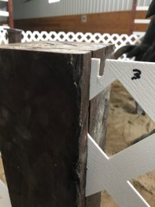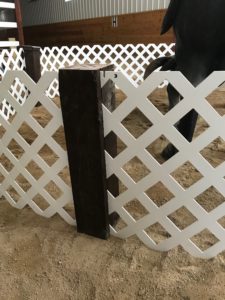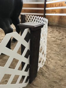 The newest idea we came up with is using plastic lattice panels available at any garden center.  The panels are 2′ x 8′ long so the inner pen requires 4 panels.  They were about $12 each.  We (Mike) then took a 6″ x 6″  post and cut four 24″ tall bases, stained them to match the rest of our obstacles.  He then cut slots in each post with a table saw to slide the lattice pieces into them.  He left the weight to the inside to help balance the panels and make it flatter to the outside of the pen.  He then notched the lattice as you’ll see in the picture to allow the decorative 6″ x 6″ cap to hold the lattice in place.  The nice thing about this inner pen is there are no sharp corners and if bumped hard enough it will all fall apart.